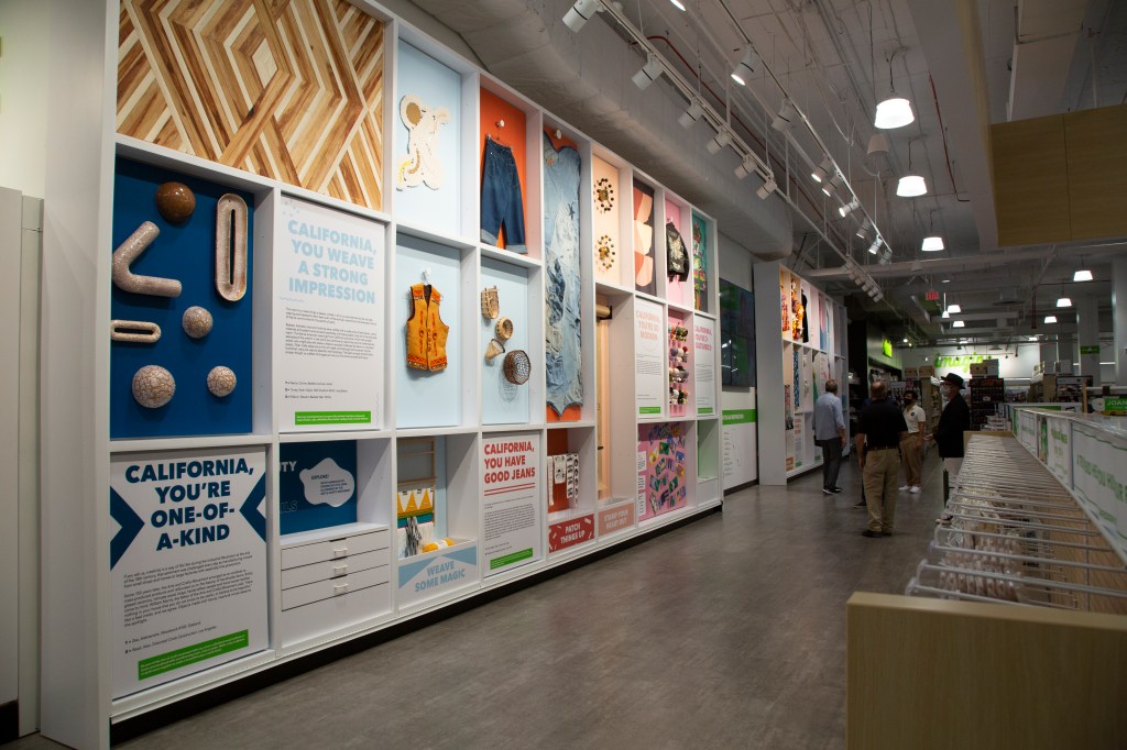 Over a year in the making, the installation was delayed due to the Covid-19 pandemic. The floor-to-ceiling exhibit, running along one side of the immense store, consists of a series of gallery boxes with artwork nestled within each box. Explanatory text is printed next to each set of boxes.